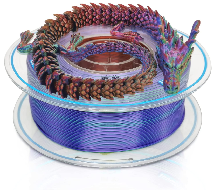 Шелковая нить YOUSU позволяет получить перламутровую яркую поверхность без дополнительной обработки.Нить трехцветная, цвета не смешиваются между собой: треть нити зеленого, треть фиолет, а треть красного цветов. Магия цвета состоит в том, что с разных ракурсов напечатанная деталь выглядит по новому.